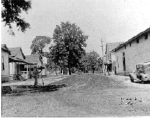 Front Street looking west from Jefferson Avenue. The commissary is on the right and barber shop, meat market and drugstore are on the left. The buildings on the left were destroyed by fire in 1939.